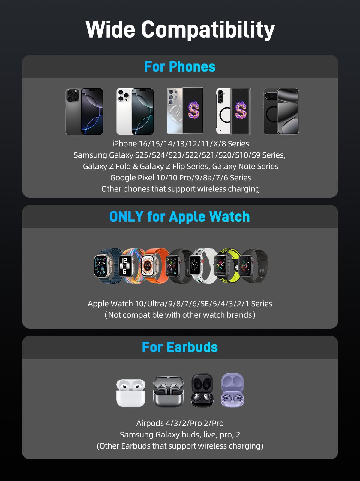 - エレガンスと耐久性の融合:この3-in-1ワイヤレス充電器は、家族や友人、あるいはスタイリッシュで効率的な充電ソリューションを求めるすべての人への素晴らしい贈り物になります。革新性と日常の利便性が融合した充電ステーションで、充電体験をワンランクアップさせましょう。